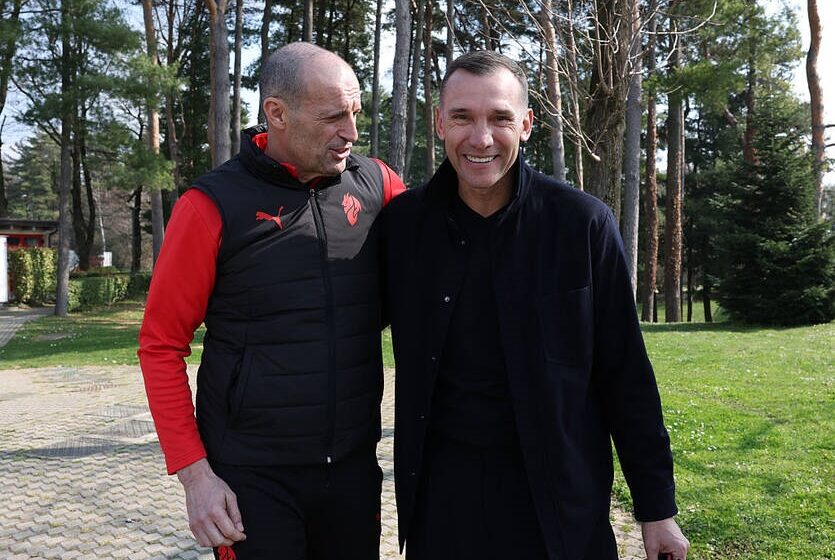 Під час нинішнього візиту на тренувальну базу клубу Шевченко провів бесіди з керманичем італійців Массіміліано Аллегрі, із спортдиром клубу Іглі Таре, а також привітав гравців своєї колишньої команди.
