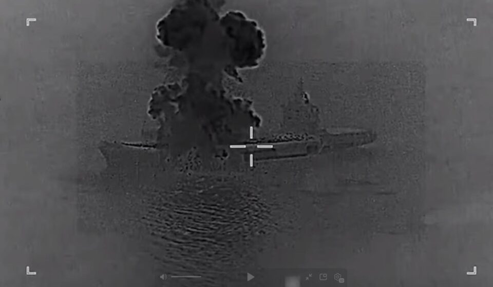 На кадрах видно, що перший потужний вибух стався в носовій частині судна – у районі польотної палуби. Після цього було друге влучення, вже в районі надбудови. Серія детонацій і пожежа, що швидко розповсюджується, призвели до знищення корабля.